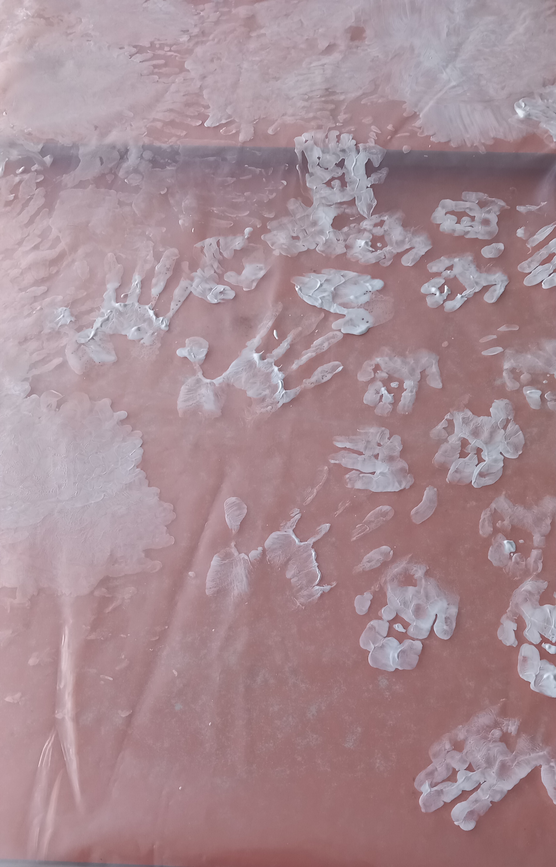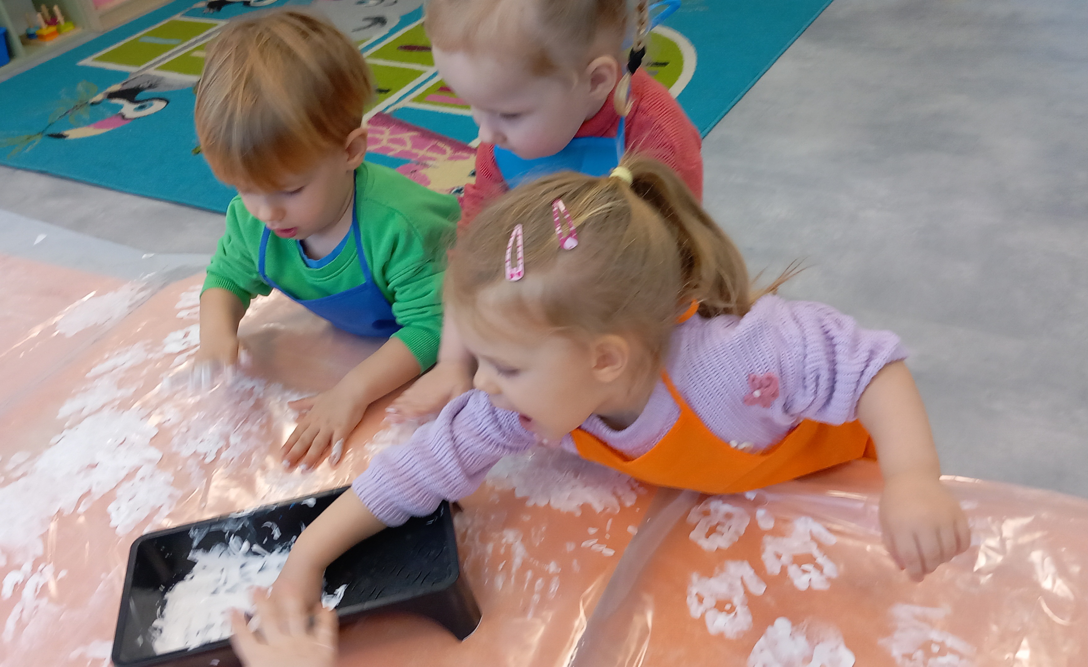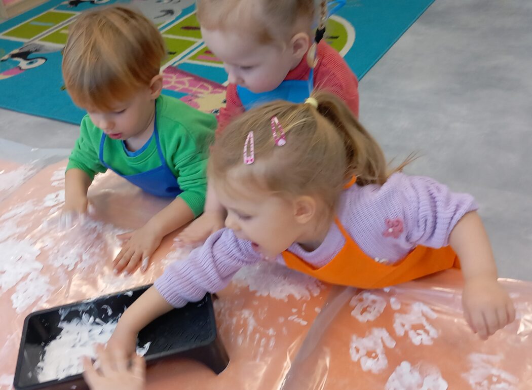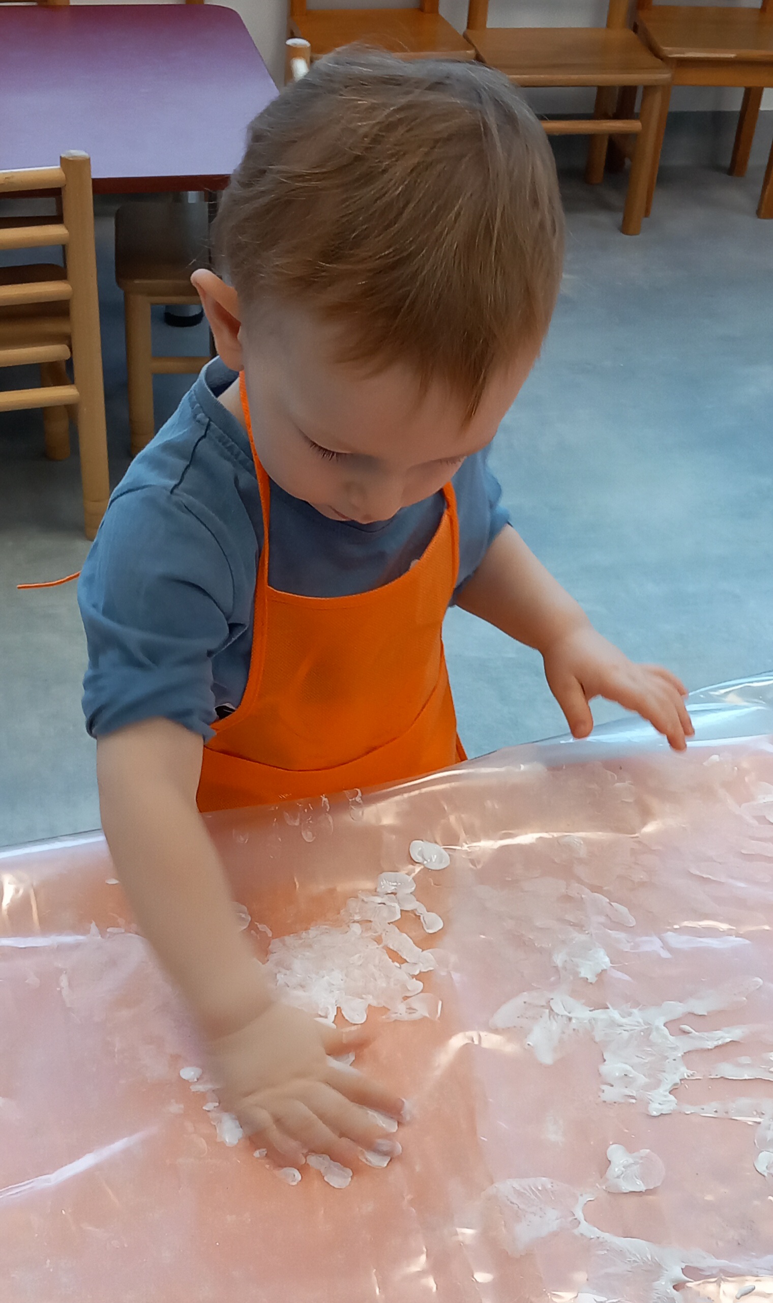 | STEAM veikla ,,Šaltos spalvos“Veiklos metu vaikai susipažino su šalta spalva (balta). Tyrinėjo per pojūčius ir kūrybinę veiklą. Naudodami pirštukus ir delniukus vaikai štampavo bei piešė ant didelės plėvelės, vaizduodami sniege paliktas pėdutes. Veikla skatino sensorinį patyrimą, kūrybiškumą ir smulkiąją motoriką.Tikslas. Skatinti vaikų kūrybiškumą, sensorinį patyrimą ir pažintį su šaltomis spalvomis.