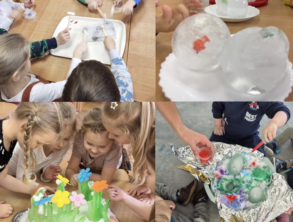 | Sausio mėn. STEAM: Eksperimentinė – tiriamoji veikla „Sniego kristalų stebuklai”Tikslas: Skatinti smalsumą tyrinėjant ledo savybes, lavinti jutiminį pažinimą ir supažindinti vaikus su gamtos reiškiniais, pvz., ledo tirpimu; formuoti snaiges naudojant skystus ir karštus klijus.Uždaviniai:1. Atlikti eksperimentus, tyrinėjant ledo savybes.2. Gaminti snaiges, naudojant skystus ir karštus klijus.Visą mėnesį veiklų metu vaikai tyrinėjo ledo savybes, stebėjo permatomus ledukų kubelius su įšalusiais spalvotais žaisliukais, lygino jų formas, struktūrą ir spalvą. Naudodami pipetes, lašino vandenį ant ledukų ir stebėjo, kaip ledas tirpsta, o užbarsčius druskos, kaip ji „graužia“ ledą. Vaikai sužinojo, kad ledas tirpsta nuo šilumos, o druska paspartina šį procesą. Vyko STEAM veikla „Sniego kristalai“, kurios metu vaikai pasigamino snaigių, naudodami skystus ir karštus klijus. Snaiges vaikai karštais ir skystais klijais piešė ant trafareto ir stebėjo, kaip jie virsta kristalais.IU mokytojos D. Terleckienė, R. Daiginienė |